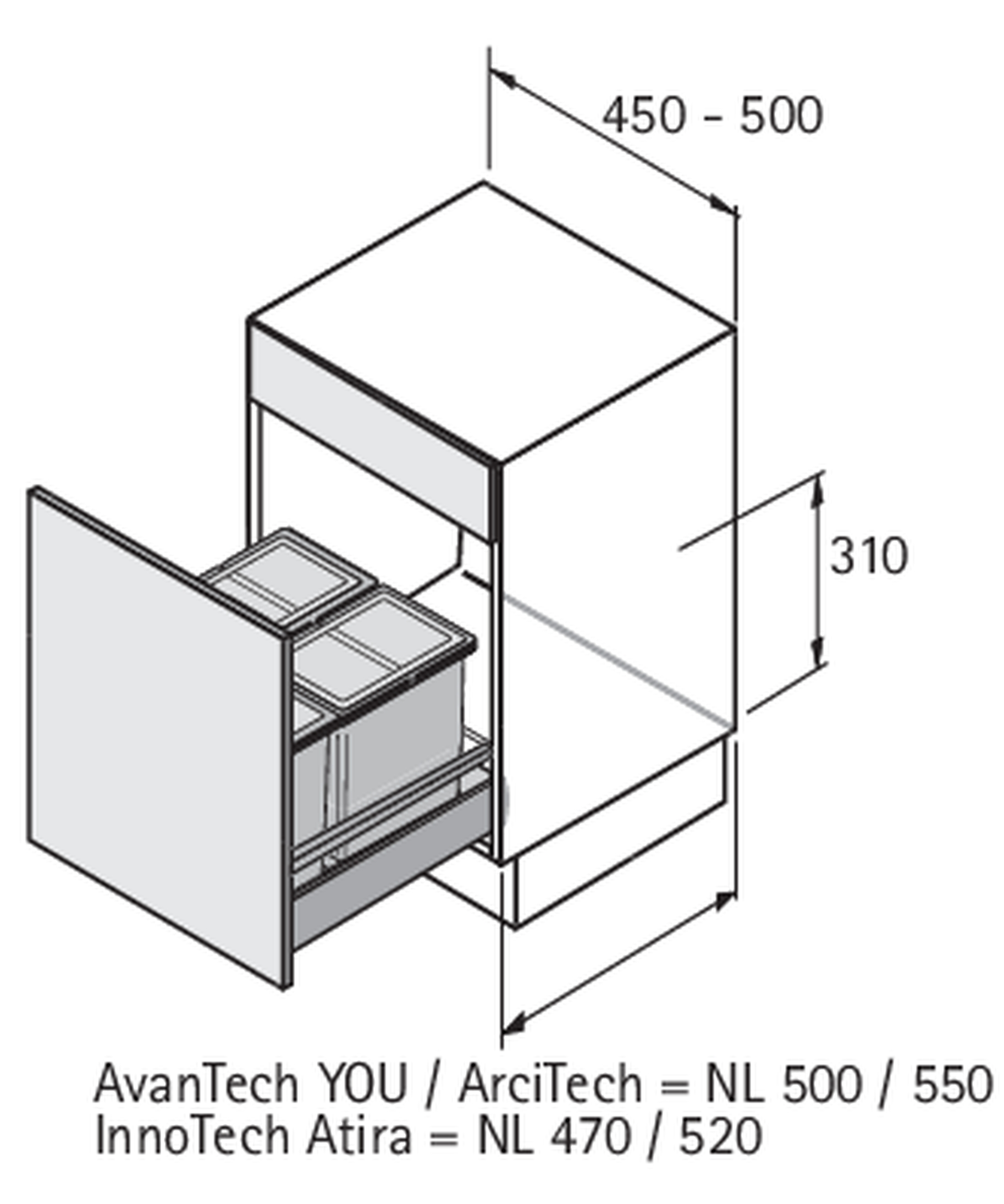 • Einbauhöhe 310 mm ab Oberkante Schubkastenboden