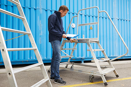 Leitern, Tritte und andere Podeste. Wir übernehmen gerne für Sie die jährlich gesetzlich anfallende Prüfung Ihrer Steighilfen. Termin buchen.